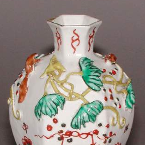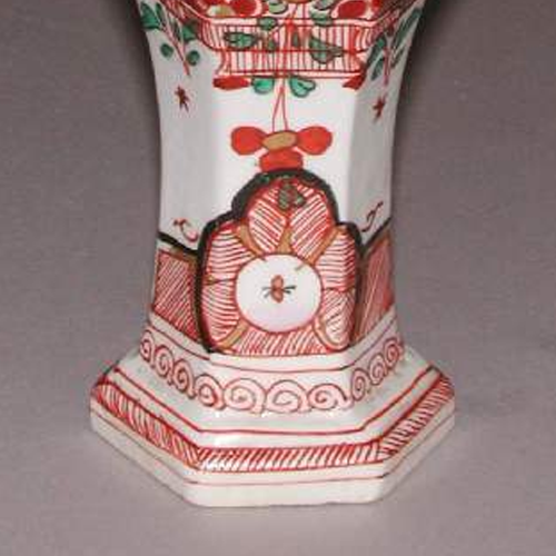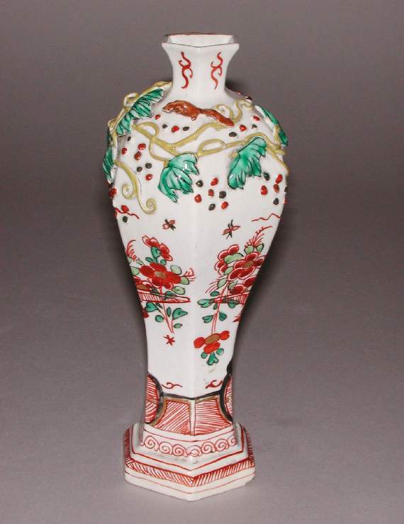 清代康熙 - 雍正时期,社会稳定,经济繁荣,制瓷业在明代的基础上进一步发展,达到了很高的水平。五彩瓷是当时瓷器生产中的重要品种,工艺精湛,色彩运用丰富。堆塑工艺在瓷器装饰中也有应用,通过堆塑可以增加瓷器的立体感和艺术感染力。花卉纹作为中国传统瓷器装饰的常见题材,象征着美好、繁荣,深受人们喜爱。六角瓶这种造型在当时也较为流行,体现了当时工匠的创新精神和人们对新奇事物的追求。同时,这一时期的瓷器大量出口,成为传播中国文化和制瓷技艺的重要载体,对世界陶瓷艺术的发展产生了深远影响。