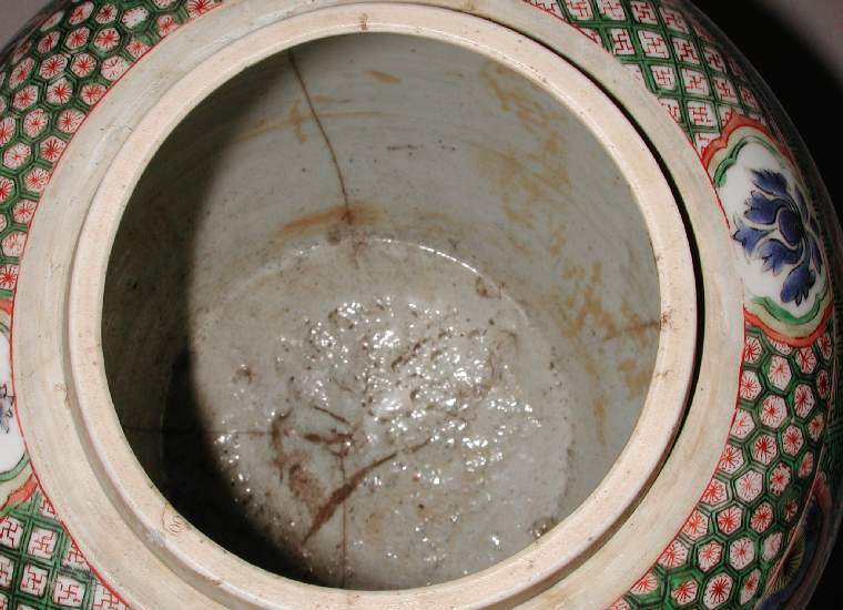细节:罐身有多处开光,开光内分别绘有瑞兽和花卉图案。瑞兽造型生动,毛发、神态刻画细致,充满威严感;花卉姿态各异,花瓣、枝叶描绘细腻,展现出自然的生机与活力。罐身其他部位满布几何纹、如意纹等辅助纹饰,线条规整,布局繁密有序。盖顶装饰有花卉图案,与罐身纹饰相呼应。罐内有明显的污渍和使用痕迹,底部有裂痕,见证了岁月的沧桑 。