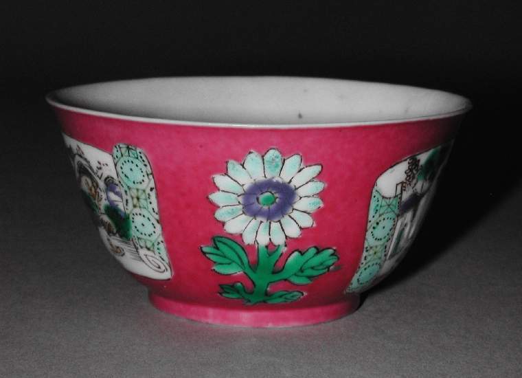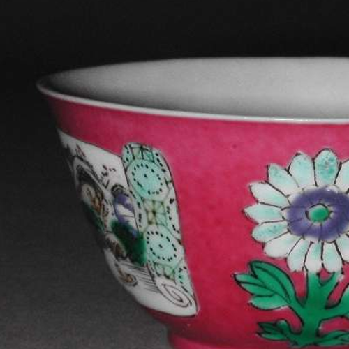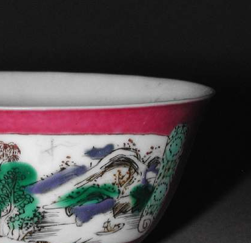 细节:碗的外壁有多处开光,开光内分别绘有山水和花卉图案。山水画中,山峦起伏,树木葱郁,溪流潺潺,一叶扁舟泛于水上,意境悠远;花卉图里,花朵姿态各异,花瓣层层叠叠,花蕊点缀其间,栩栩如生。粉色釉地上还装饰有单独的花卉图案,花朵绘制细腻,与开光内的纹饰相互呼应。碗口沿处有一圈极细的金边,虽历经岁月有些磨损,但仍增添了器物的精致感。