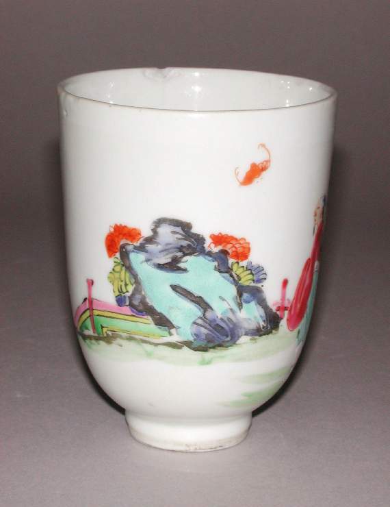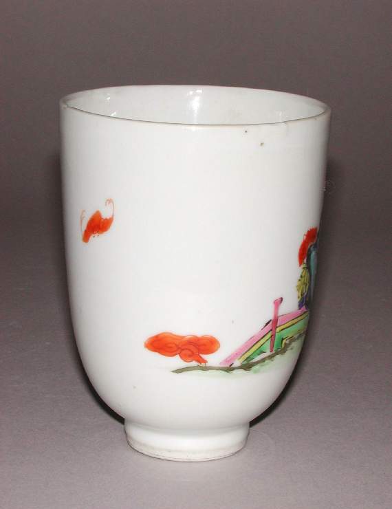 细节:杯身绘有人物形象,一位身着长袍的人物,手持类似拐杖的器物,身旁似乎有童子相随 ,人物神态、服饰细节有一定表现,但绘画精细度不算顶级。周围还点缀有山石、花卉、红色蝴蝶等图案,山石以蓝绿色表现,花卉色彩鲜艳,蝴蝶以红色绘制,增添了画面的生动性。不过杯口边缘有小的破损,影响了整体的完整度 。