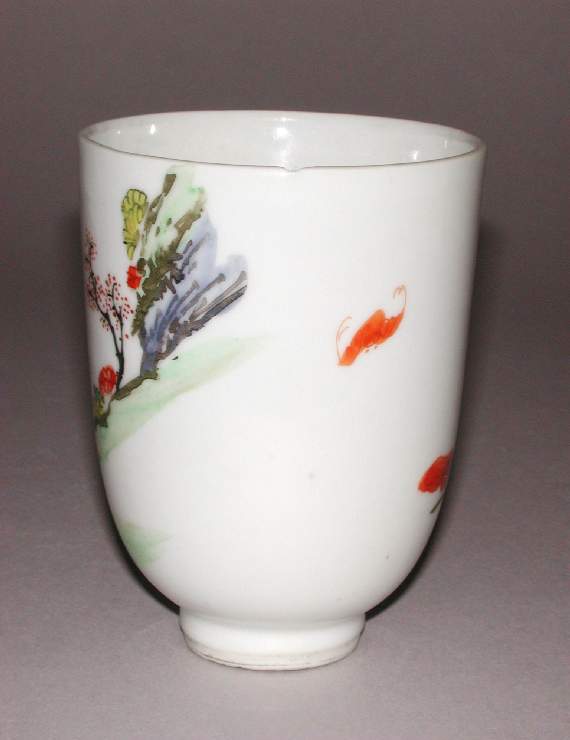 整体造型:杯子为直口,深腹,圈足,造型规整,是较为常见的杯类器型,便于持握和使用。