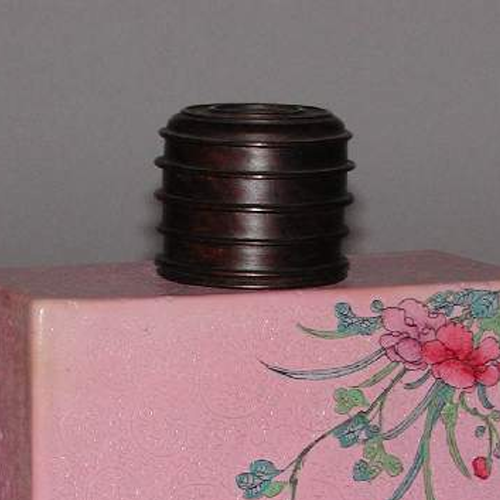 整体造型:瓶子呈方形,直口,短颈,平肩,直腹,底部为方形圈足。整体造型规整,线条简洁硬朗,给人一种端庄稳重之感。瓶口处有一个深色的木质瓶盖,与瓶身形成对比。