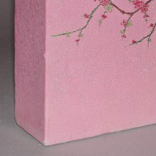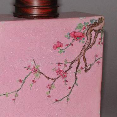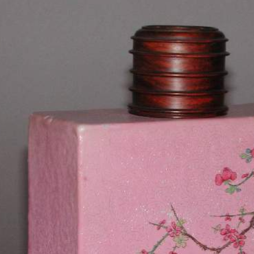 整体造型:瓷瓶呈四方形,直口,短颈,瓶身垂直而下,底部为四方圈足,造型规整、端庄稳重。瓶口处配有一个深色木质瓶盖,与粉色瓶身形成色彩对比。