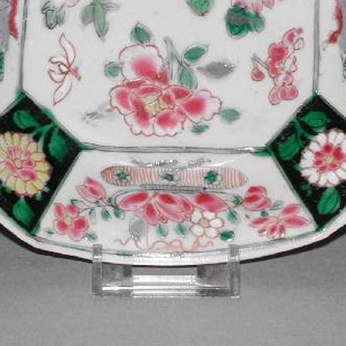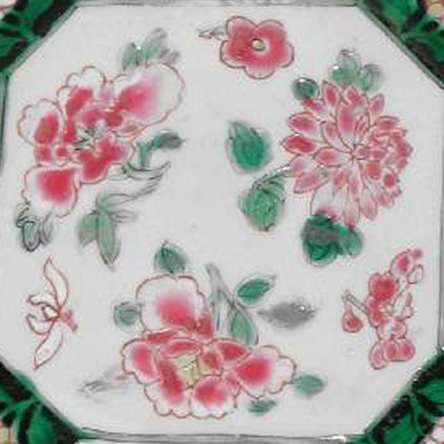 细节:盘心及边缘分布多个开光区域,每个开光内都绘有不同姿态的花卉,花朵饱满,花瓣层次分明,花蕊清晰可见,展现出花卉的娇艳与生机。花枝、花叶的线条流畅自然,部分花朵还点缀有蝴蝶,增添了画面的生动性。不过,盘体存在一些细微的磨损痕迹,显示出其经历了一定的岁月。