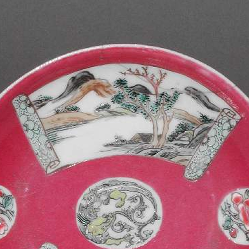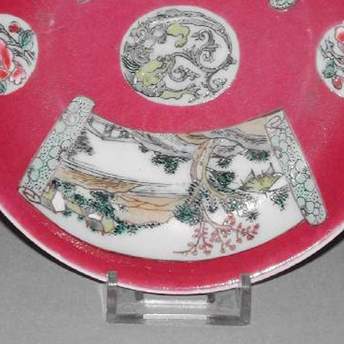 材质与色泽:以瓷土为胎体,质地较为细腻。盘正面主体施红色釉,色泽鲜艳浓郁,开光区域施白釉,白釉温润洁净。粉彩色彩丰富,有绿色的树木、粉色的花卉、褐色的山石等,色彩搭配和谐,富有层次感。盘背面施白釉,底部有一些细微磨损痕迹。