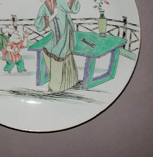 细节:盘心绘有一位身着传统服饰的仕女,仕女姿态优雅,似在整理发间簪花,身旁的桌子上摆放着花瓶,瓶中插有鲜花。仕女后方有两名童子,童子形态活泼。周围还点缀有栏杆、树木等庭院景致,营造出闲适的生活氛围。盘边缘无过多复杂装饰,简洁大方。不过,盘体存在一些细微的磨损和开片现象,显示出其年代久远。