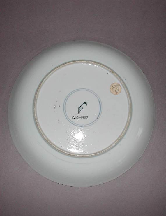 材质与色泽:以瓷土为胎体,质地较为细腻。盘内以白釉为底,色彩丰富,运用绿、红、蓝等彩料绘制图案;盘外壁施白釉,底部边缘有岁月留下的细微痕迹。