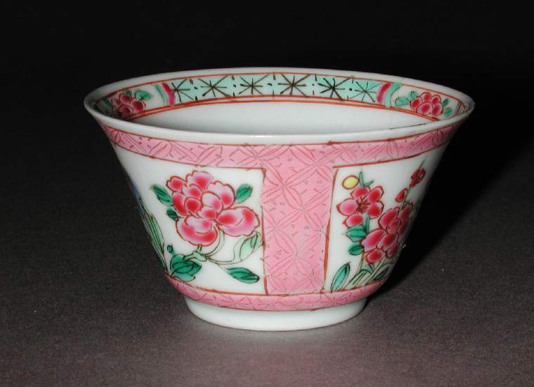 杯子:口沿处有一圈装饰花纹带,由几何图案与小花纹组成。杯身有多个开光区域,每个开光内绘有盛开的粉色花卉,花朵饱满,花瓣层次分明,绿色的枝叶穿插其间,线条流畅自然。