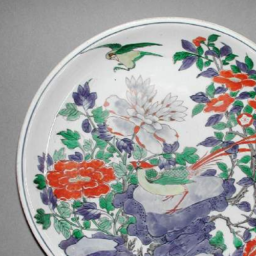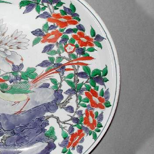 清代是中国瓷器发展的重要时期,五彩瓷器在明代基础上进一步发展。康熙时五彩瓷器达到高峰,色彩鲜艳,绘画精细。清晚期,尽管制瓷工艺较前期有所衰退,但民间制瓷依然活跃。花鸟题材在清代瓷器装饰中极为常见,寓意吉祥美好,象征着自然的和谐与生机。同时,晚清时期,由于列强入侵和社会动荡,大量中国瓷器通过贸易或非法途径流向海外,成为外国博物馆的藏品,这件五彩花鸟纹盘就是近代中国文物流失的一个见证。