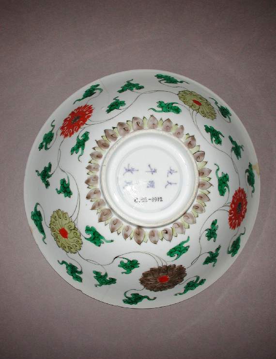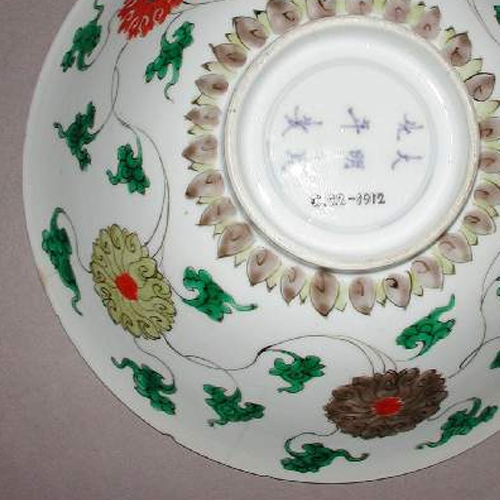 材质与色泽:以瓷土为胎体,质地较为细腻。碗内外壁均施白釉,釉面光洁,微微泛出温润的光泽。外壁采用五彩工艺进行装饰,主要使用了绿色、橙色、棕色等彩料,色彩对比鲜明,给人以古朴而又艳丽的视觉感受。