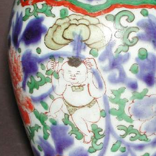 细节:罐身主体部分绘有婴戏图,孩童形态活泼可爱,或玩耍嬉戏,或手持器物 ,形象生动。周围点缀着盛开的花卉,有红色、粉色的牡丹等,花朵饱满,花瓣层次分明,绿叶穿插其间,显得生机勃勃。口沿处装饰有蓝绿色的卷草纹,底部边缘饰有红白相间的几何纹,增加了器物的装饰性。不过,罐底有一些细微的磨损痕迹,显示出其经历了一定的岁月。