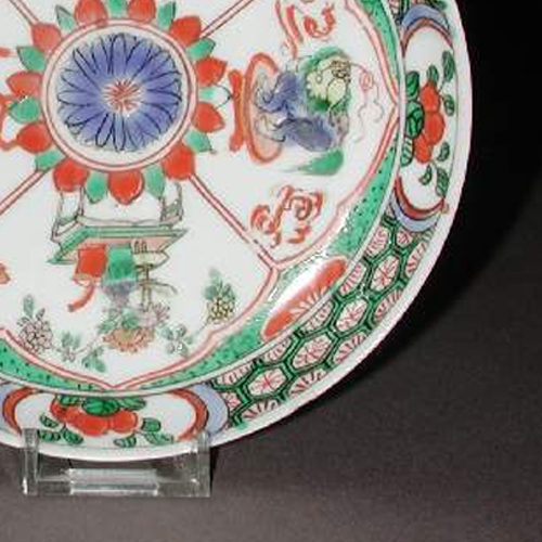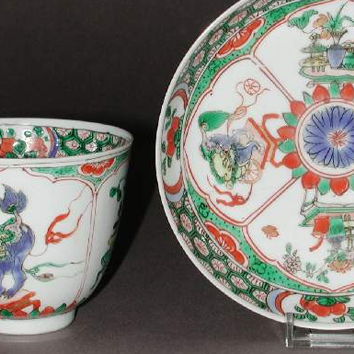 碟子:盘心有圆形开光,内绘花卉图案,周围分布多个扇形开光,每个开光内也绘有博古图案,如鼎、瓶、如意等,寓意吉祥。盘边缘装饰有一圈精美的花纹,由绿色和红色组成的曲线纹,增加了碟子的美观度和精致感。杯碟表面存在一些细微的磨损痕迹,显示出一定的年代感。