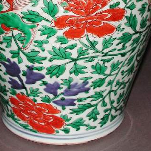 细节:罐身主体绘有绿色的瑞兽,瑞兽造型生动,毛发根根分明,富有动感。周围点缀着盛开的花卉,有红色的牡丹、紫色的芍药等,花朵饱满,花瓣层次分明,绿叶繁茂,穿插其间。罐颈部有一圈彩色的尖状纹饰,色彩有红、绿、紫等,增加了器物的装饰性。盖子上也绘有红色的花卉,与罐身花卉相呼应。不过,罐底和器物表面存在一些细微的磨损痕迹,显示出其年代久远。