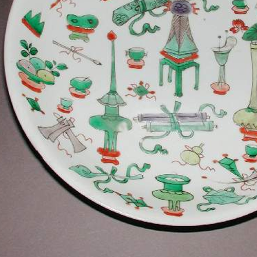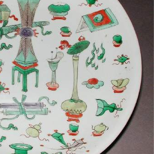 细节:盘心及盘身布满了各种博古图案,包括古器物如鼎、尊、瓶、炉,还有书籍、如意、瓜果等。这些图案以绿彩为主色调,搭配红色、灰色等进行描绘,线条简洁流畅。图案分布错落有致,营造出一种古雅的氛围。不过,盘体存在一些细微的磨损和开片现象,显示出其年代的久远。