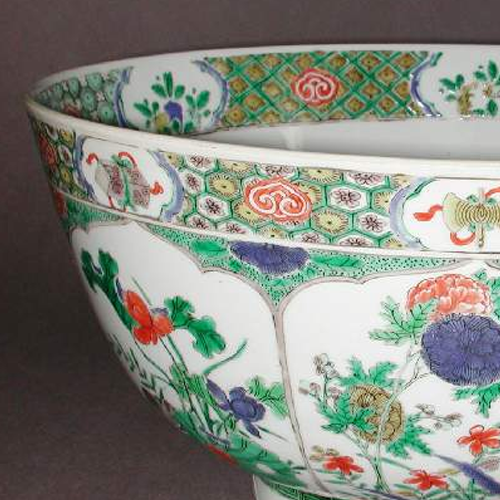 细节:碗口沿内侧有一圈装饰带,绘有几何纹和花卉纹,色彩搭配和谐。碗身外壁有多个开光区域,每个开光内绘有不同的花卉图案,如牡丹、菊花、荷花等,花朵绘制细腻,花瓣层次分明,绿叶穿插其间,显得生机勃勃。开光外的区域则绘有锦地纹等辅助纹饰,增加了器物的装饰性和层次感。碗底可见一些细微的磨损痕迹,显示出其经历了一定的使用和岁月侵蚀。