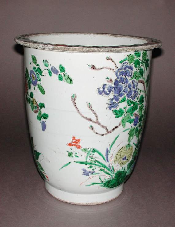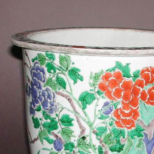 清代是中国瓷器发展的重要时期,五彩瓷器在明代的基础上进一步发展。康熙时期五彩瓷器达到了较高的艺术水准,色彩鲜艳,绘画精细。到了清晚期,尽管制瓷工艺相较于前期有所衰退,但民间制瓷业依然保持着一定的规模和活力。花卉题材在清代瓷器装饰中极为常见,不同花卉寓意丰富,如牡丹象征富贵,梅花寓意高洁等,反映了当时人们对美好生活的向往和追求。同时,晚清时期,由于列强的侵略和社会的动荡不安,大量中国瓷器通过贸易或非法手段流失海外,成为外国博物馆的藏品,这件五彩花卉纹花盆就是这一历史背景下中国文物流失的一个例证。