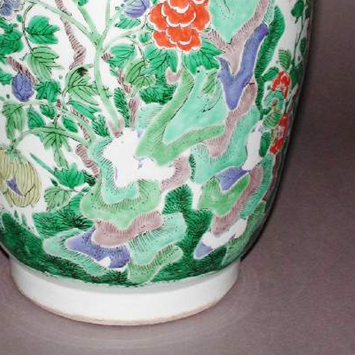 细节:花盆外壁绘有多组花卉图案,有盛开的红色牡丹、紫色的芍药等,花朵饱满,花瓣层次分明,绿叶穿插其间,枝叶形态各异,生动展现出花卉的生机与活力。花枝的线条流畅自然,富有动感。口沿处有一圈细微的磨损痕迹,显示出一定的使用痕迹和年代感。
