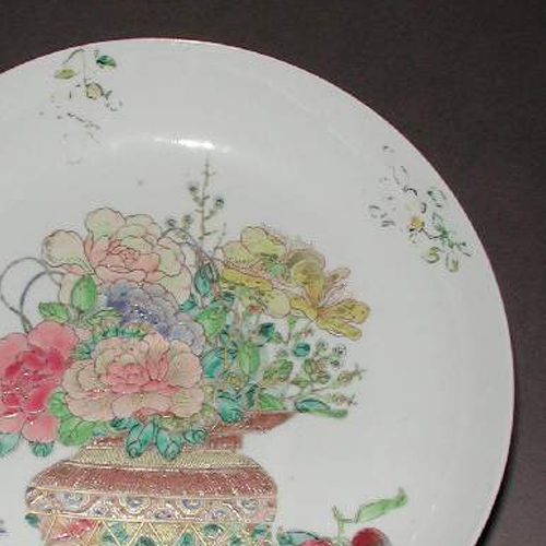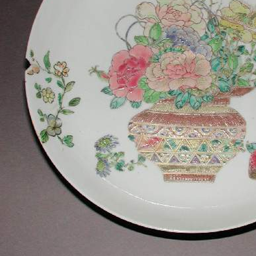 细节:盘心绘有一个花瓶,瓶中插满了各种花卉,有粉色的牡丹、黄色的菊花等,花朵形态逼真,花瓣层次分明,旁边还绘有红 色的果实,增加了画面的生动性。盘边缘及空白处点缀着一些小型的花卉枝叶图案,疏密有致。器物表面有一些细微的磨损痕迹,显示出其年代久远。