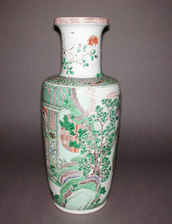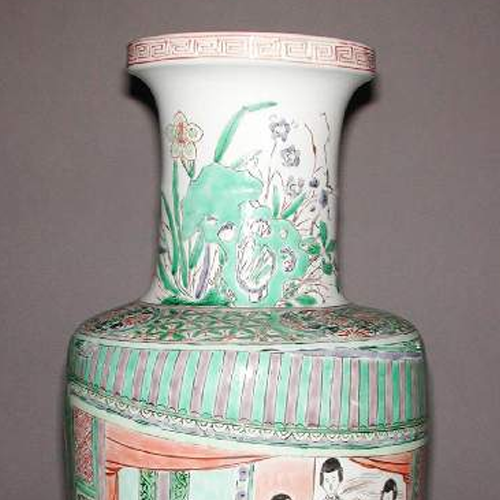 细节:颈部绘有花卉纹,花朵形态各异,枝叶舒展。瓶身主体绘有人物故事图案,人物身着古代服饰,神态各异,有的在室内交谈,有的在庭院活动,场景生动,仿佛在讲述一段历史故事。周围还点缀有树木、山石、建筑等元素,丰富了画面内容,绘制上虽然细节表现不如清早期细腻,但也展现了晚清时期民间瓷器艺人的绘画水平。口沿处有一圈红色的回纹装饰带,增加了器物的装饰性。器物表面有一些细微的磨损痕迹,显示出其年代的久远。