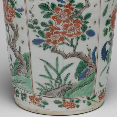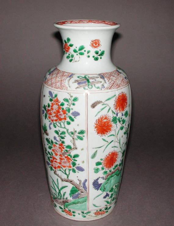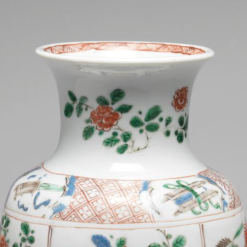 细节:瓶口沿内侧有一圈红色装饰带。颈部及肩部绘有锦地纹和折枝花卉纹,锦地纹规整细致,花卉纹花朵饱满。瓶身主体部分以多个开光的形式,分别绘有不同姿态的花卉,如盛开的牡丹、娇艳的菊花等,花朵绘制细腻,花瓣层次分明,绿叶穿插其间,枝叶的形态各异,展现出勃勃生机。器物表面有一些细微的磨损痕迹,显示出一定的年代感。