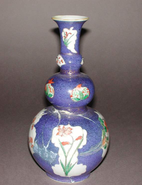 清代是中国瓷器发展的重要时期,瓷器的制作工艺和装饰艺术在前代的基础上不断发展创新。葫芦瓶作为一种传统的瓷器造型,自唐代以来就深受人们喜爱,因其形状与 “福禄” 谐音,被赋予吉祥美好的寓意。五彩瓷在明代已经有了较大发展,清代康熙时期达到鼎盛,色彩鲜艳,绘画精美。到了清晚期,虽然制瓷工艺整体较前期有所衰退,但民间制瓷业依然保持着一定的规模和活力,花卉等吉祥图案在瓷器装饰中广泛应用,反映了当时人们对美好生活的向往。同时,晚清时期,列强的侵略和掠夺,使得大量中国珍贵文物流失海外,这件蓝地五彩花卉纹葫芦瓶就是近代中国文物流失的一个见证。