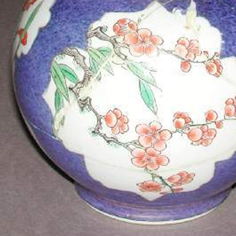 细节:瓶口和颈部有零星的五彩花卉和果实图案,如红色的石榴等,寓意多子多福。瓶身主体部分有多处留白,留白区域内绘有盛开的花卉,如粉色的梅花,梅花枝干苍劲,花朵形态逼真,绿叶点缀其间,显得生机勃勃。瓶身有一些明显的裂痕,显示出其经历过岁月的磨难和可能的保存不当。
