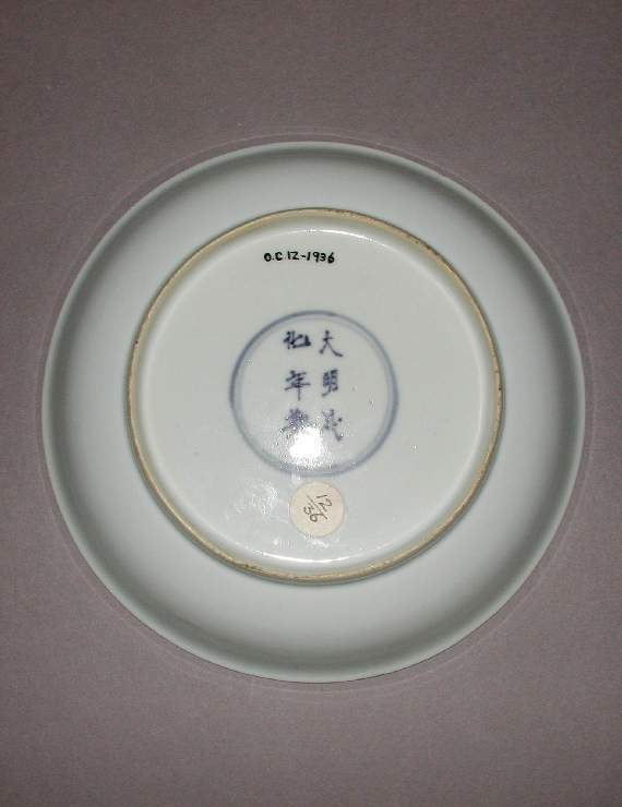 细节:盘心绘有一位仕女,仕女发髻高挽,身着红色传统服饰,服饰上有精致的花纹装饰,她姿态优雅,手持物品,身旁衬以绿色的山石等景物,山石造型独特,增加了画面的层次感。盘底有青花 “大明成化年制” 六字双圈款,但字体书写较为绵软,与明代成化朝真品款识的刚劲有力有别,同时盘底还标注有收藏编号 “0.C12-1936”。