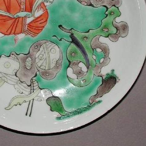 材质与色泽:以瓷土为胎体,质地较为细腻。盘内施白釉,釉面光洁,为五彩纹饰提供了良好的底色衬托;盘外壁施白釉,底部圈足处有一些细微磨损痕迹。采用五彩工艺装饰,色彩较为丰富,有红、绿、黑等色,色彩对比鲜明,给人以古朴而艳丽的感觉。