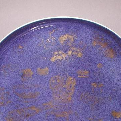 材质与色泽:以瓷土为胎体,质地细腻。盘内施霁蓝釉,色泽深沉,呈现出静谧而高贵的气质;盘外壁同样为霁蓝釉,底部圈足处施白釉。采用描金工艺,在蓝釉上描绘出金色的图案,虽历经岁月,部分金彩已有磨损脱落,但仍能看出当初装饰的华丽。