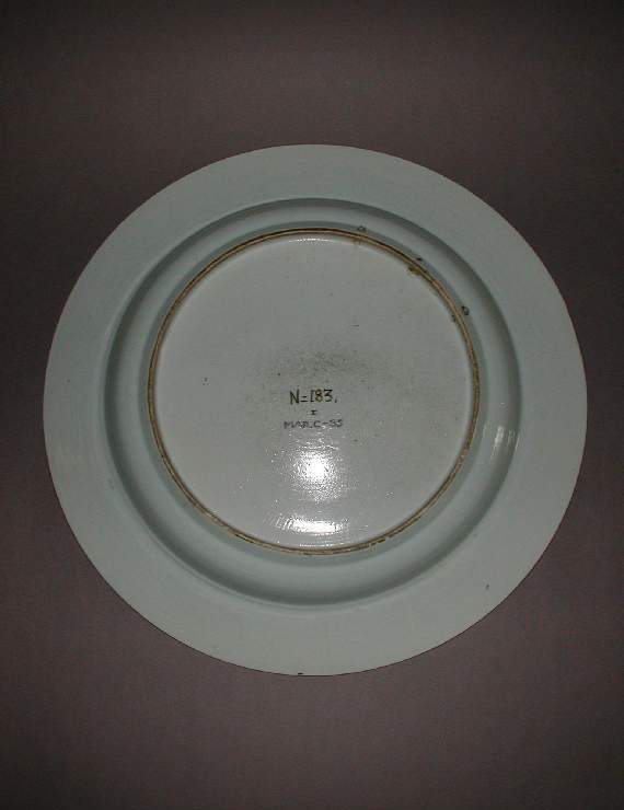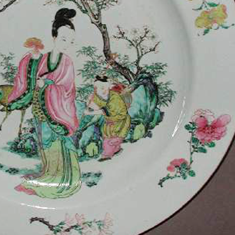细节:盘心绘有一位身着粉色和绿色传统服饰的仕女,姿态优雅,身旁有童子和瑞鹿,童子似乎在与仕女互动,瑞鹿温顺伫立,营造出祥和的氛围。周围点缀着梅花树,梅花盛开,枝干苍劲。盘边缘装饰有一圈折枝花卉图案,有粉色、黄色的花朵,枝叶穿插其间,布局疏密得当,增加了器物的装饰性。盘底有一些细微的磨损痕迹,还标注有收藏编号 “N-I83.” 等信息。