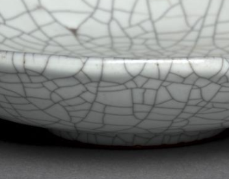 本品规格为直径15.3厘米,高度3.5厘米。整体造型为浅盘状,口沿呈花口形,线条优美流畅,富有韵律感。通体施哥釉,釉色温润,布满典型的哥窑开片,裂纹纵横交错,细密如网,呈现出独特的 “金丝铁线” 效果,这是哥窑瓷器极具标志性的工艺特征,为器物增添了古朴雅致且富有层次感的美感。