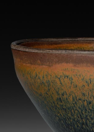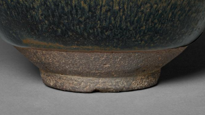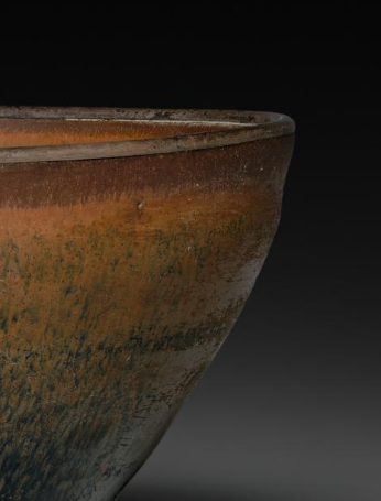 本品规格为直径12.4厘米,高度7厘米。盏身施黑釉,釉面呈现出如兔毫般的丝状纹理,纹理色泽丰富,从棕褐渐变为蓝黑,丝丝缕缕,自然灵动,尽显建窑黑釉 “兔毫” 纹的独特艺术魅力。盏的造型为敞口、深腹、小圈足,整体线条流畅,比例协调。黑釉与兔毫纹相互映衬,既具古朴雅致之美,又展现出宋代陶瓷工艺的精湛技艺,是北宋建窑瓷器中颇具代表性的作品,也是研究宋代茶文化与陶瓷艺术的重要实物资料。