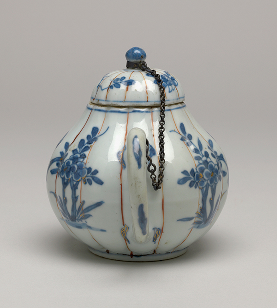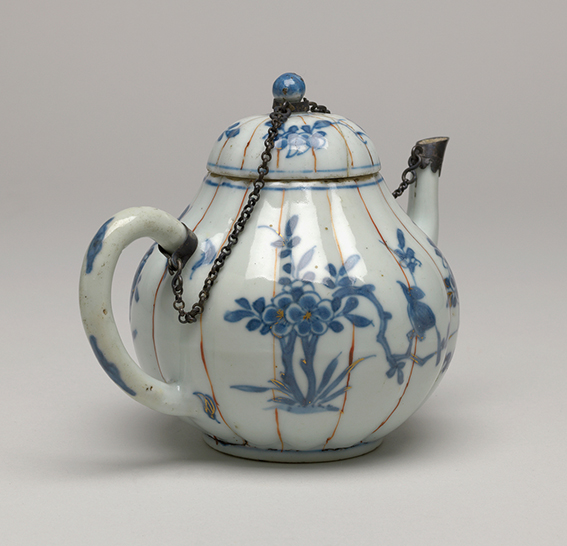 清代青花描金花鸟纹瓜棱形瓷壶