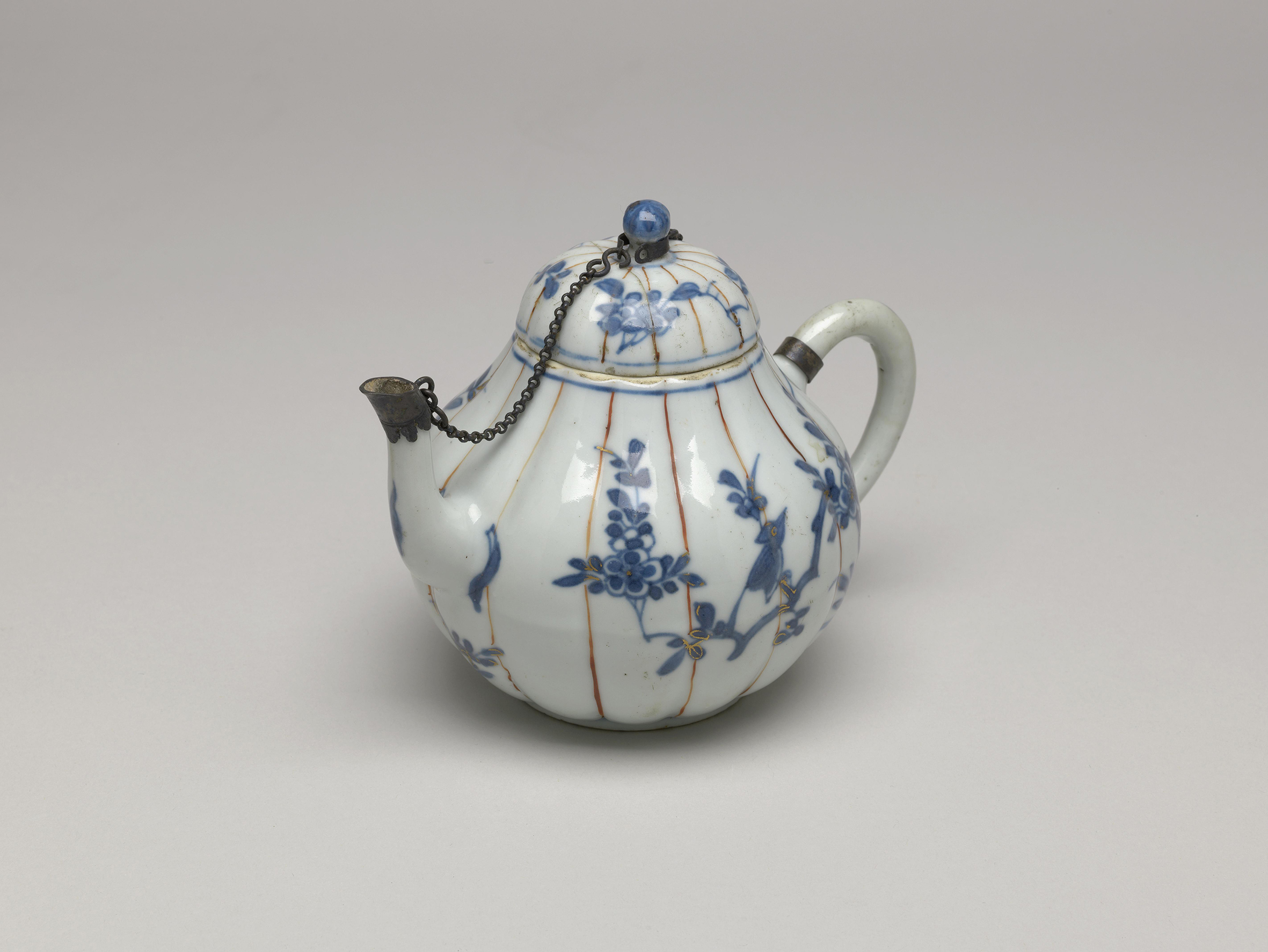 细节:壶身瓜棱间绘有花鸟图案,花朵姿态各异,鸟儿或栖息枝头、或振翅欲飞,生动形象。盖面也有相应的青花花卉纹饰,与壶身相呼应。壶盖与壶身通过金属链相连,防止壶盖脱落,金属链虽有氧化痕迹,但工艺仍清晰可见。壶流和把手处有金属包边,既起到保护作用,也增添了装饰性。