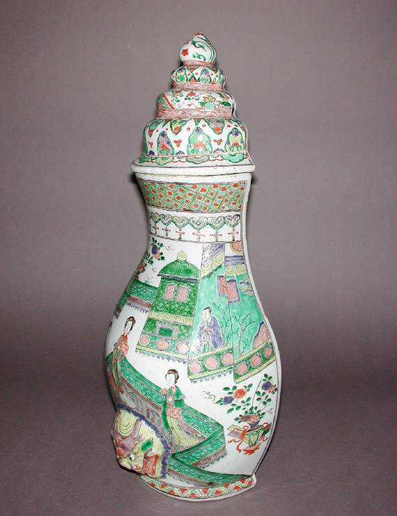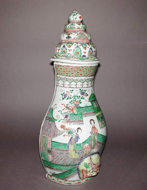 清代是中国瓷器发展的重要时期,五彩瓷器在明代的基础上不断发展创新。康熙时期五彩瓷器达到了很高的艺术水准,色彩浓艳,绘画精细,题材广泛。到了清晚期,虽然制瓷业整体呈现衰退趋势,官窑瓷器的生产规模和质量有所下降,但民间制瓷依然保持着一定的活力。人物楼阁题材在清代瓷器装饰中较为常见,反映了当时人们对社会生活和建筑艺术的关注与喜爱。同时,晚清时期,西方列强对中国进行经济侵略和文化掠夺,大量中国珍贵文物流失海外,这件五彩人物楼阁纹盖罐就是近代中国文物流失的一个例证,见证了那段中国文物大量外流的历史。