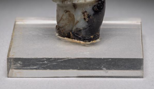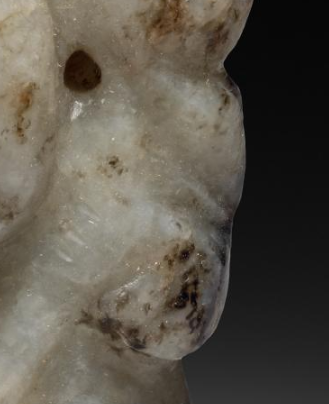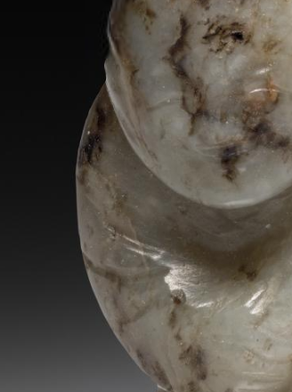 本品规格为4厘米。整体以玉石为材质,玉料带有自然的纹理与沁色,增添了古朴之感。雕件塑造出童子的形象,童子身形小巧,姿态生动。童子似双手持握或背负着莲花造型,细节处虽因玉石本身的纹理等因素,雕刻痕迹需仔细观察,但仍能感受到工匠对童子形象与莲花元素的刻画意图。雕件工艺细腻,通过简洁的线条与造型,展现出北宋时期玉器雕刻在人物题材上的风格特点,将童子的灵动与莲花的意象融合,具有一定的艺术与历史价值,是研究北宋玉器艺术及民俗文化的生动实物资料。