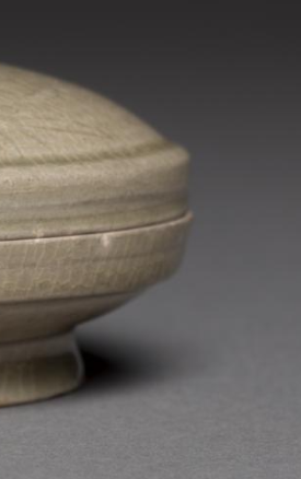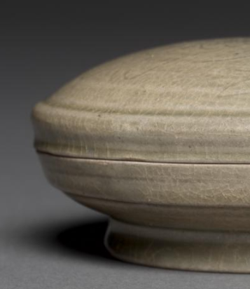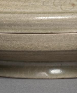 本品规格为直径12.5 厘米,高度5.4厘米。粉盒整体呈扁圆形,由盒盖与盒身相扣合而成,造型规整圆润。其胎质细腻,通体施青釉,釉色温润,带有自然的开片纹理,尽显古朴雅致之美。盒盖顶部刻有花卉纹样,线条纤细流畅,花卉形态生动,虽历经岁月,仍能感受到刻花工艺的精巧细致,将花卉的柔美与生机巧妙展现。