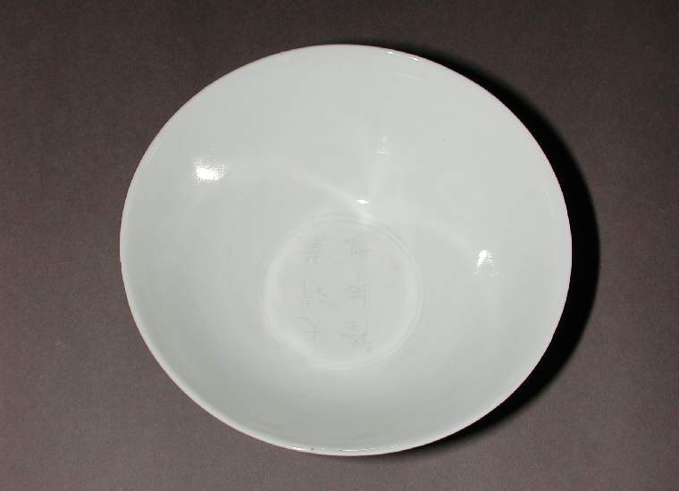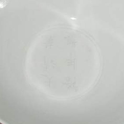 细节:碗心有暗刻款识,字迹较为清晰,增添了器物的文化内涵。口沿处线条圆润,高足与碗身衔接自然,底部平整。虽然整体素净,但暗刻款识成为了点睛之笔,体现了清代瓷器在简约中追求细节的工艺特点。