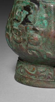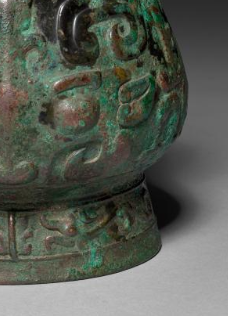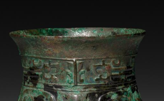 本品规格为16厘米。整体呈青铜质地,因岁月侵蚀,表面布满斑驳的铜绿锈迹,尽显古朴沧桑之感。器型上,口部外撇,腹部鼓胀,下接圈足,造型规整且富有韵律。器身装饰有典型的兽面纹,纹饰线条繁复精美,兽面的双目、鼻梁等细节刻画清晰,周围辅以卷曲的云纹等装饰,层次丰富,展现出东周时期青铜器铸造工艺的精湛,以及当时独特的艺术审美风格,是研究东周青铜文化与艺术的重要实物。