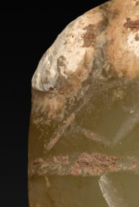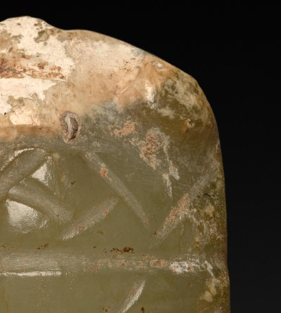 本品规格为6 厘米。整体造型模拟蝉的形态,但并非十分写实,带有一定的抽象和简化特征。蝉的身体部分轮廓较为清晰,上部雕刻有类似蝉翼纹路的线条,虽然简洁,但能体现出蝉翼的质感和形态 。器物下部有明显的分叉,可能是模拟蝉的尾部或腿部形态。整体造型简洁古朴,保留了东周时期玉器造型的一些典型特征。