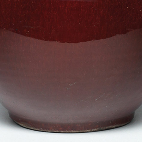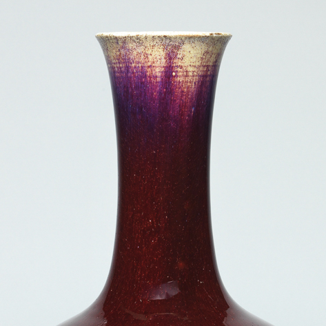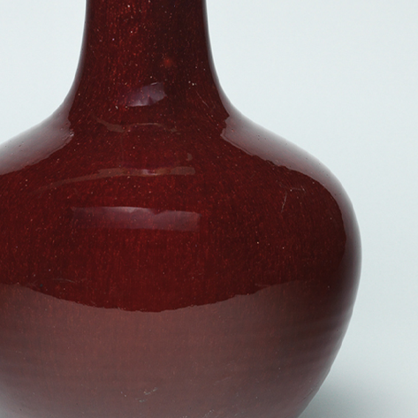 细节:瓶口边缘釉层较薄,呈现出淡淡的米黄色,与主体的红色形成对比。圈足处的胎质略显粗糙,和细腻的釉面形成反差。瓶身整体光素无纹,以其独特的釉色之美展现出瓷器的典雅与庄重。