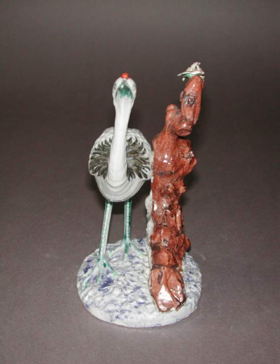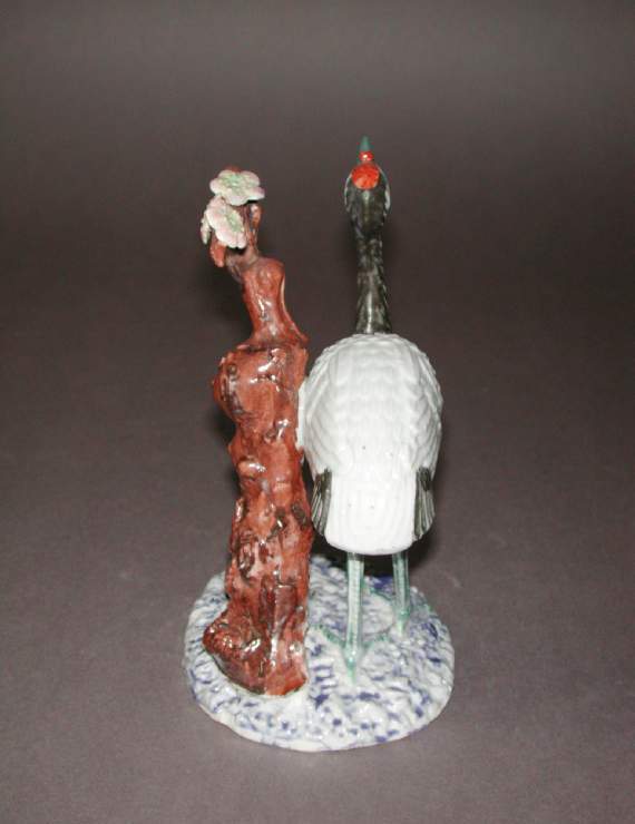 整体造型:瓷塑呈现出一只仙鹤立于梅桩旁的场景,仙鹤身姿挺拔,梅桩造型古朴,底部有圆形底座,整体造型生动形象,富有自然意趣,兼具观赏性与艺术表现力。