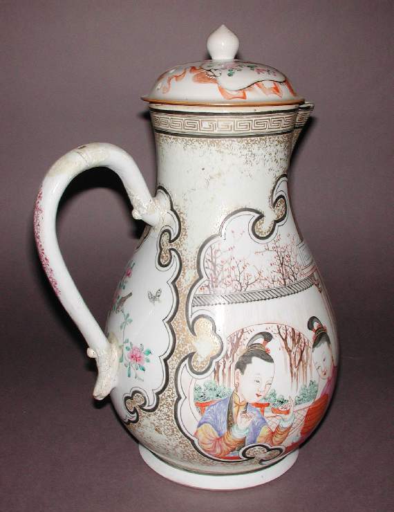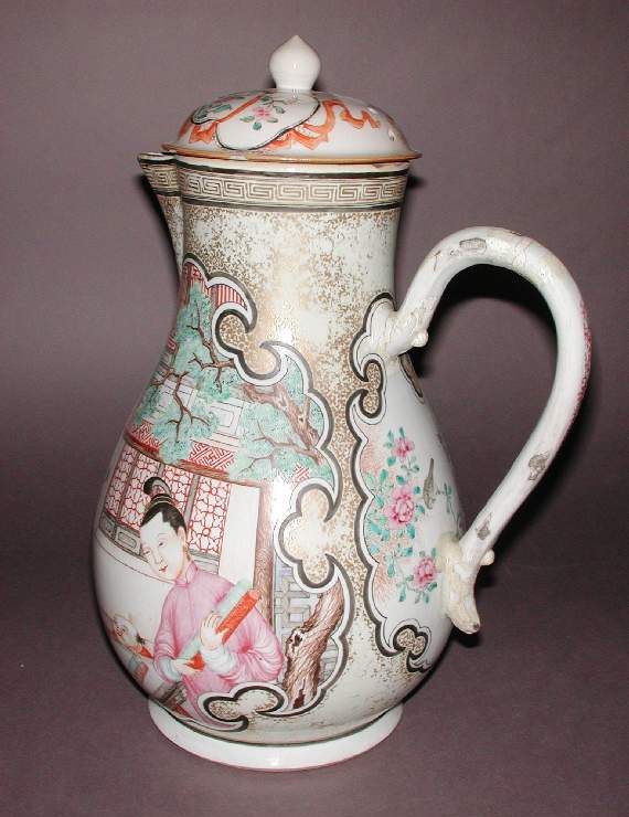 整体造型:执壶为带盖造型,壶身呈梨形,一侧有弯曲的长流,另一侧有环形把手,整体造型规整,线条流畅,兼具实用性与观赏性,是典型的清代执壶样式。