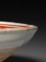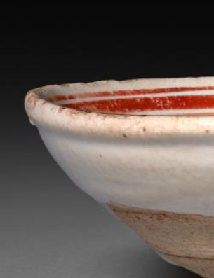 本品规格为直径11.8厘米,高度4.5厘米。整体造型为敞口、浅腹、圈足,器型较为规整。碗的内壁以白色为底,装饰有红彩绘制的条纹,色彩对比鲜明,虽历经岁月,红彩仍有一定的留存,展现出当时的彩绘工艺特点。碗的外壁下半部分及圈足未施釉,露出胎体,胎质略显粗糙,带有金代瓷器的质朴风格。