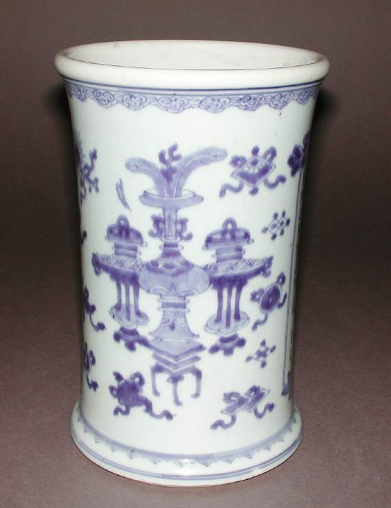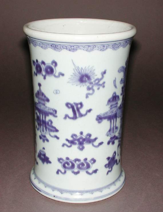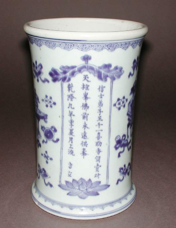 细节:口沿和底部边缘各有一圈青花如意云头纹作为装饰带。笔筒腹部主体绘有博古纹,图案中包含了鼎、炉、花瓶、书籍等古代器物,还有祥云、花卉等纹饰点缀其间,布局疏密得当。其中一面有竖排青花文字,记录了供奉信息 ,文字书写工整,增添了文化韵味。