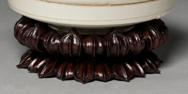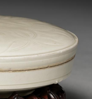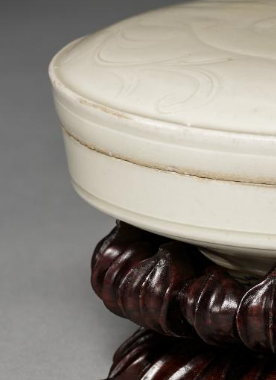 本品规格为10.6 厘米。盖盒整体呈圆形,由盒身与盒盖两部分组成,施有纯净的白釉,釉色温润雅致。盒盖表面采用刻花工艺进行装饰,纹样线条流畅自然,似花卉等植物图案,通过刻花技法使纹样富有层次感与立体感,展现出金代陶瓷工艺中刻花装饰的精湛技艺。盒身搭配精致的木质底座,底座造型如花瓣般层叠,与白釉盖盒相得益彰,既凸显了盖盒的精美,也为其增添了一份古朴庄重的韵味,是研究金代陶瓷艺术与工艺的重要实物资料。