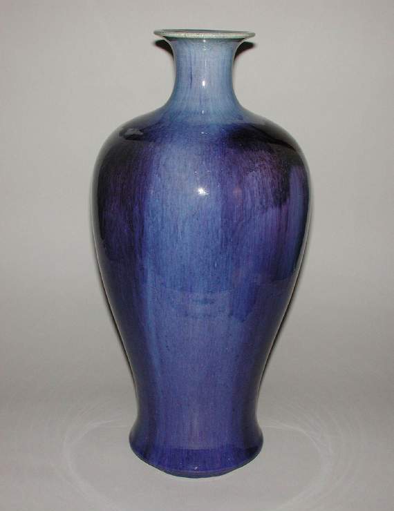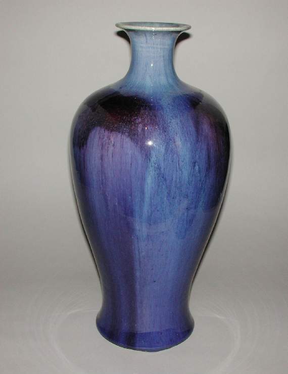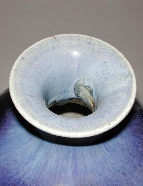 细节:瓶口较小,颈部短而细,肩部丰满圆润,腹部逐渐收窄,圈足规整。瓶身釉色的纹理分布错落有致,没有规律,增添了器物的神秘感和艺术价值。瓶口处釉色相对较浅,与瓶身浓郁的蓝紫色形成对比,更显层次。