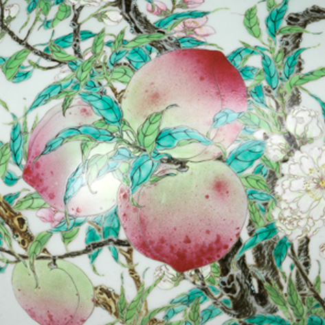 材质与色泽:以细腻的瓷土为胎体,通体施白釉,釉面光洁莹润。采用粉彩工艺绘制纹饰,色彩丰富柔和,桃子呈现出粉嫩的红色,枝叶为鲜艳的绿色,还有白色的花朵点缀其间,色彩搭配清新雅致,与洁白的釉底相得益彰。