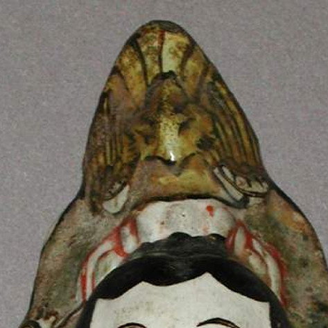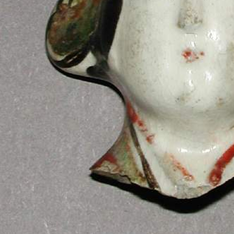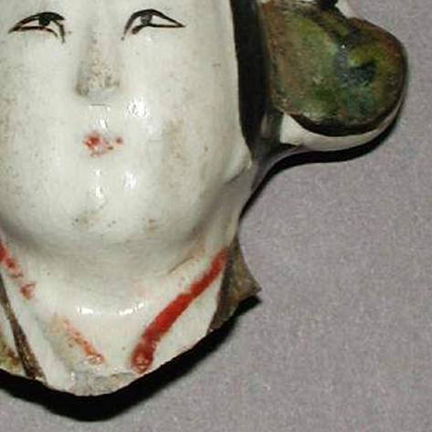 材质与色泽:以陶土为材质,质地相对疏松。表面施有彩绘,脸部为白色,帽子部分有绿色、金色等色彩,脖颈处有红色线条,虽历经岁月,部分色彩有剥落,但仍能看出原本色彩搭配较为丰富。