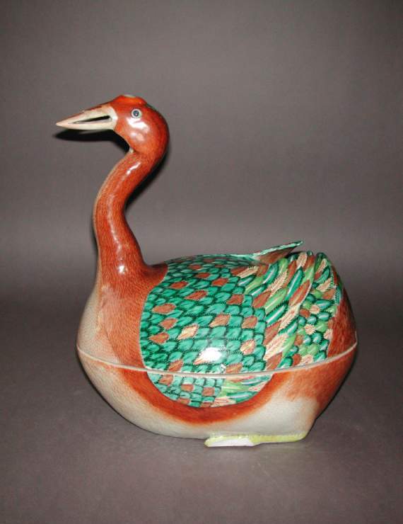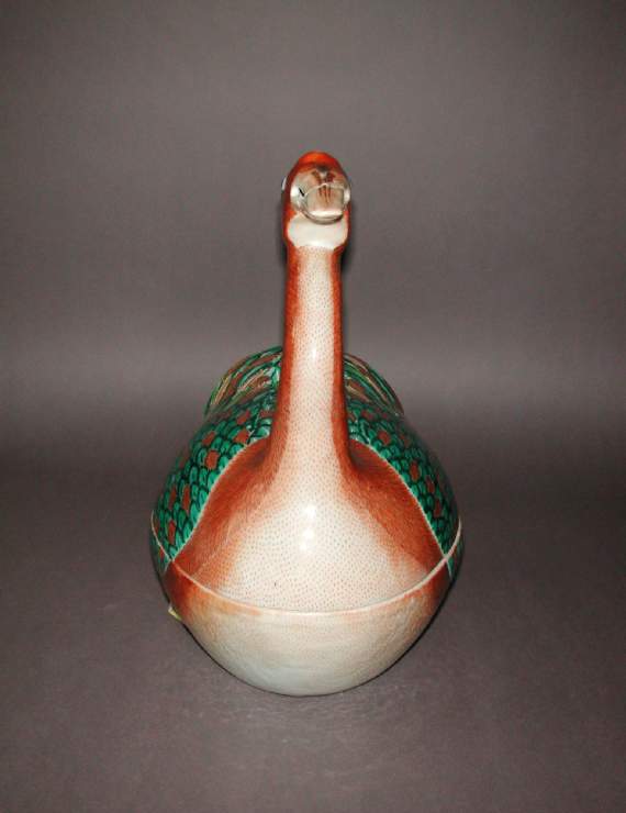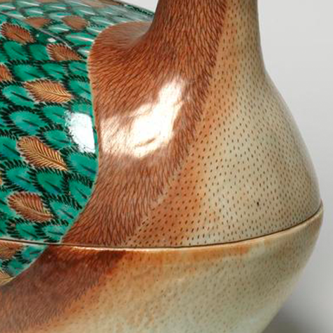 整体造型:整体塑造成鸭子的形状,呈伏卧姿态,鸭首高昂,鸭身圆润,背部有可开启的盒盖,造型生动形象,将实用的盖盒功能与仿生的鸭子造型巧妙结合,兼具实用性与观赏性。